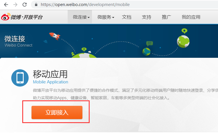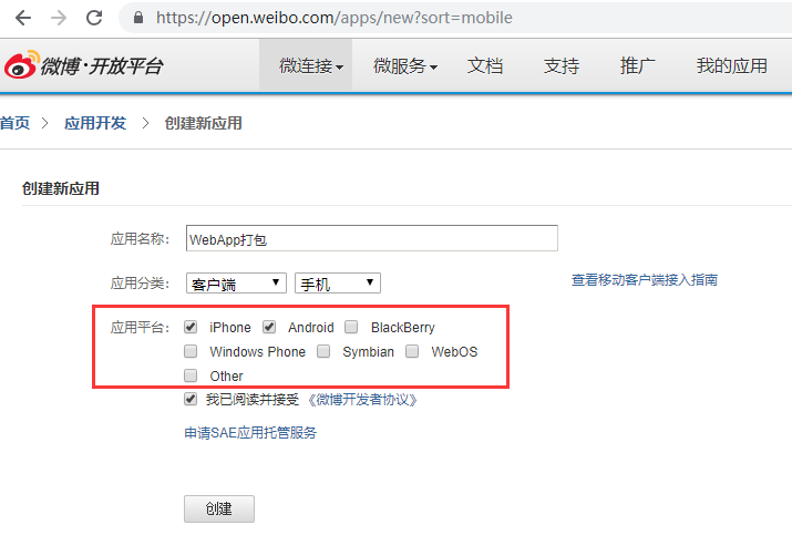 1. 登录“微博开放平台” https://open.weibo.com接入移动应用。 填写 应用名称,按需勾选 应用平台