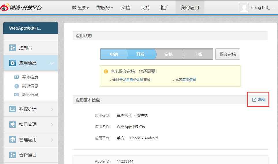 3. 应用信息 - 基本信息 - 编辑,填写 APP 包名和(MD5)签名。