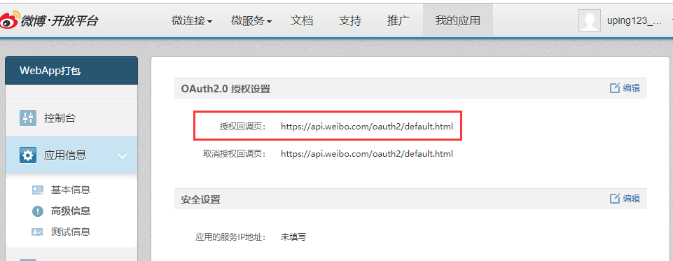 4. 应用信息 - 高级信息 - OAuth2.0 授权设置,填写 授权回调页(这个要与打包平台上填的相同),如果不需要接收微博通知,填写 https://api.weibo.com/oauth2/default.html 即可。